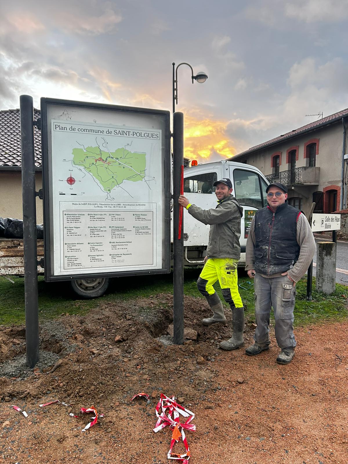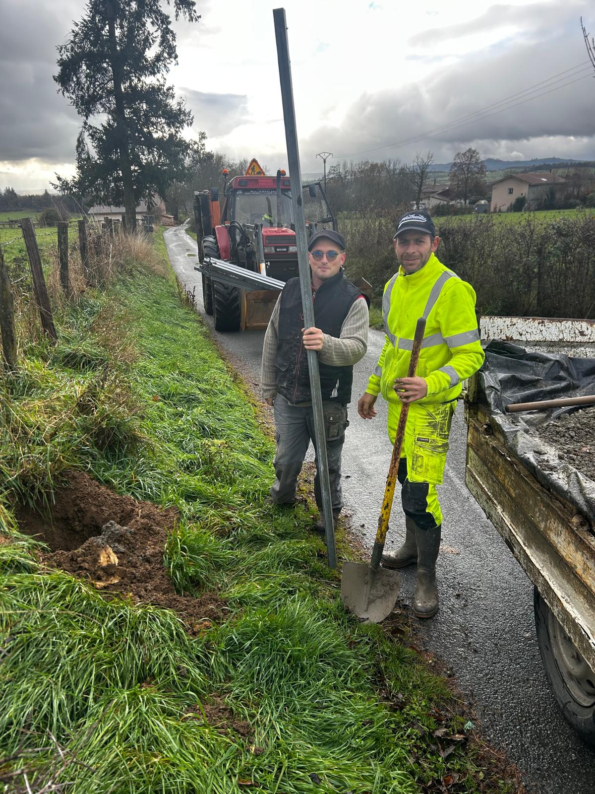 Un grand bravo à Yohan, notre cantonnier, et Stéphane de l’ESAT de Crémeaux, qui sont actuellement à l’œuvre pour poser les nouveaux poteaux dans la commune.